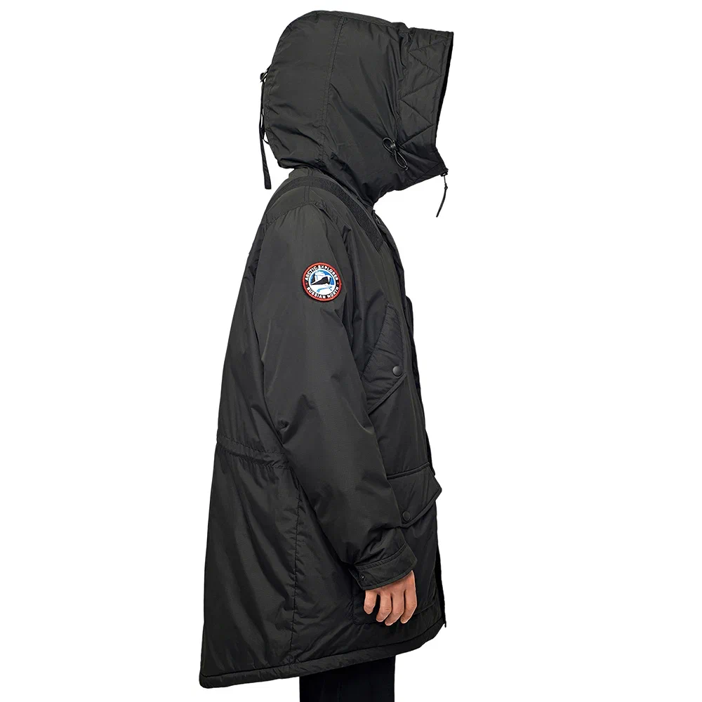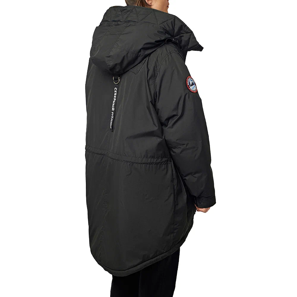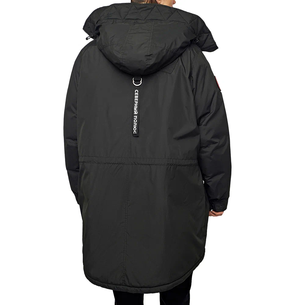 - Фирменный декор: съемный шеврон «Аrctic Explorer» на рукаве, погон на одном плече, повторяющий настоящие полярные погоны, нашивка «Северный полюс» на хлястике капюшона.